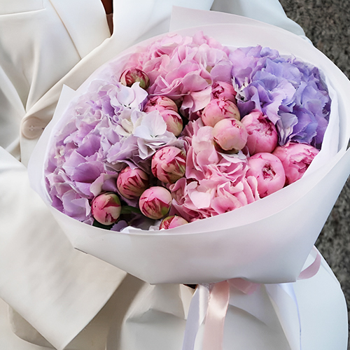 Букет "Бабочки в животе" из гортензий и пионов