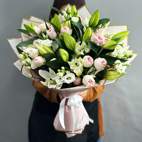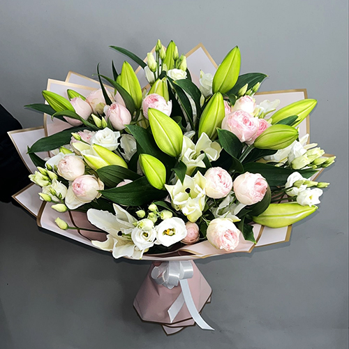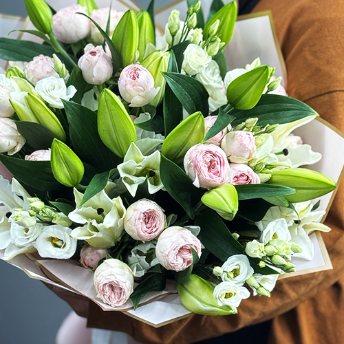 Букет из лилий, пионовидных кустовых роз Мэнсфилд Парк и эустом (50 см)